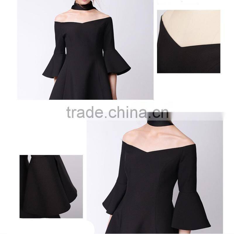 Korean Style Black Elegant Bell Sleeves Prom Party Sexy Women Dress