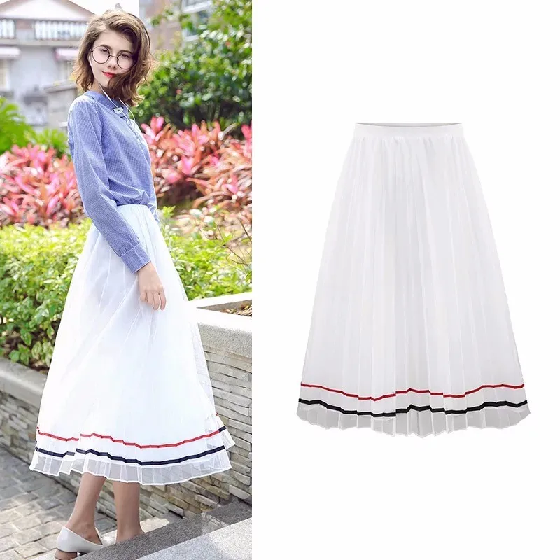 Girl Summer Black Stripe White Skirt Women Pleated Skirt