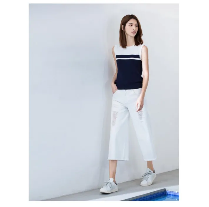 Seven point loose denim jeans could make your leg looks more better. The white color make you look more fresh and