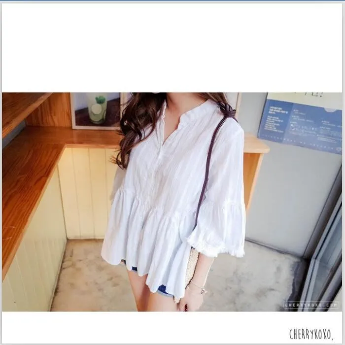 New Design Ladies Transparent Cotton Half Flare Sleeve Blouses With Tassel Loose Women Shirt