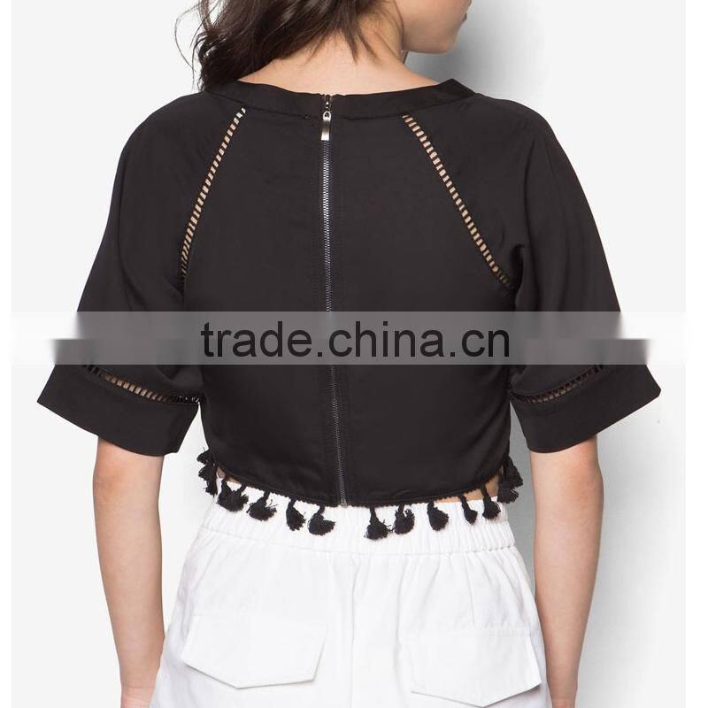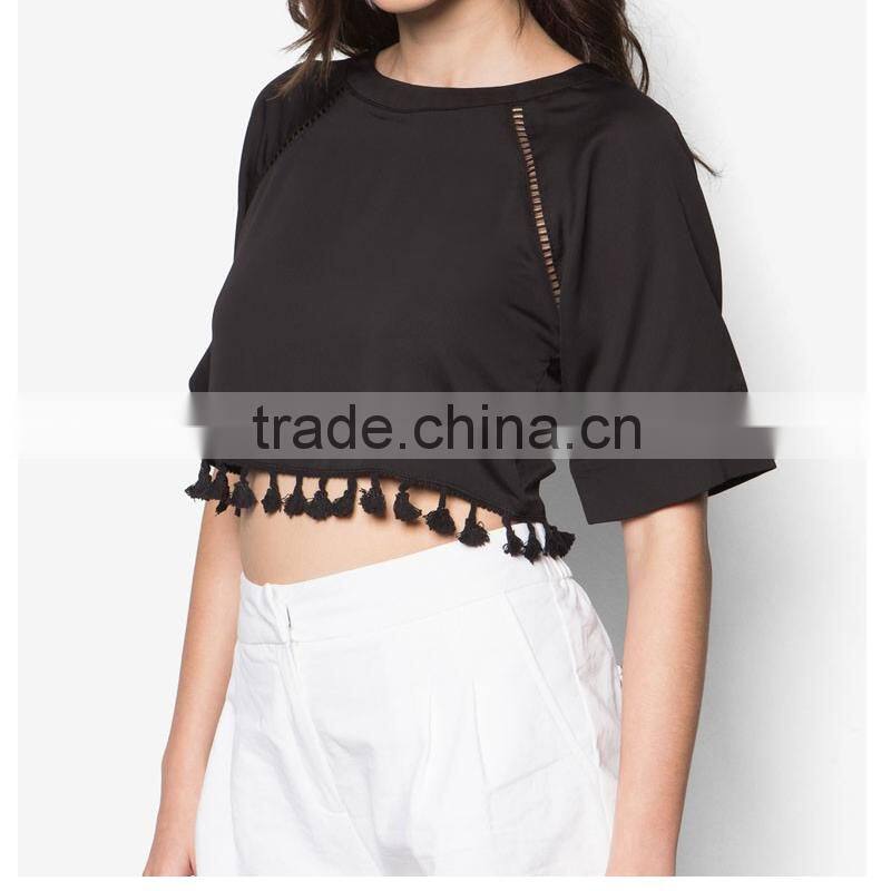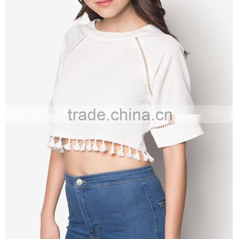 Home > Products > Shirts/ Blouses > Raglan Sleeve Crop Top With Tassel Hem Women Short Sleeves Shirt