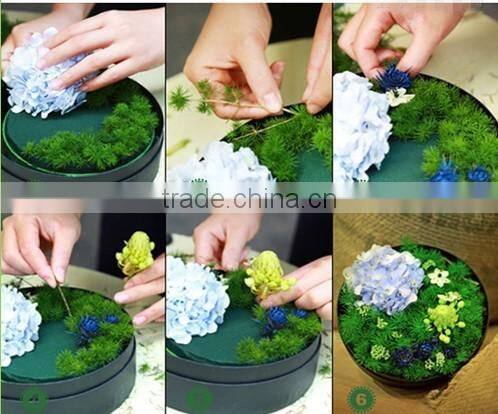 Cut floral foam in blocks with right size; Put the floral foam into water to absorb enough water naturally so that it can sink into water. Then take it out and place it in a box, and finally arrange flowers. In this way, flowers can get fixed as well as Moisturized. Besides, flowers can be inserted above / around floral foam.