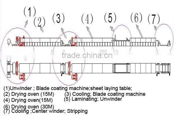 A.B Raw materials are conveyed to injection head on the rack truck’s by the filter metering pump, the injection head moves back and forth on the patterned paper at a constant speed , scraper on the assembly line’s scrapes the materials into film, and then heating the film into foam, which will be laminated with the base material( Split Bonded Leather, Substrate leather or Other Material) when the PU foam present a stringy state , the compression roller grinds them into a synthetic, at last, the PU leather will be separated on the assembly line after heating and shaping in drying oven.