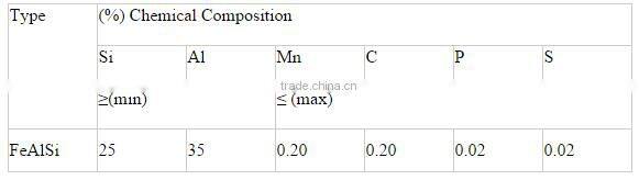 | Dimensions | Si:25%min,Al:35%min,Mn:0.2%max,C:0.2%max,P:0.02%max,S:.02%max | Chemical Composition | Si,Al,Mn,C,P,S |