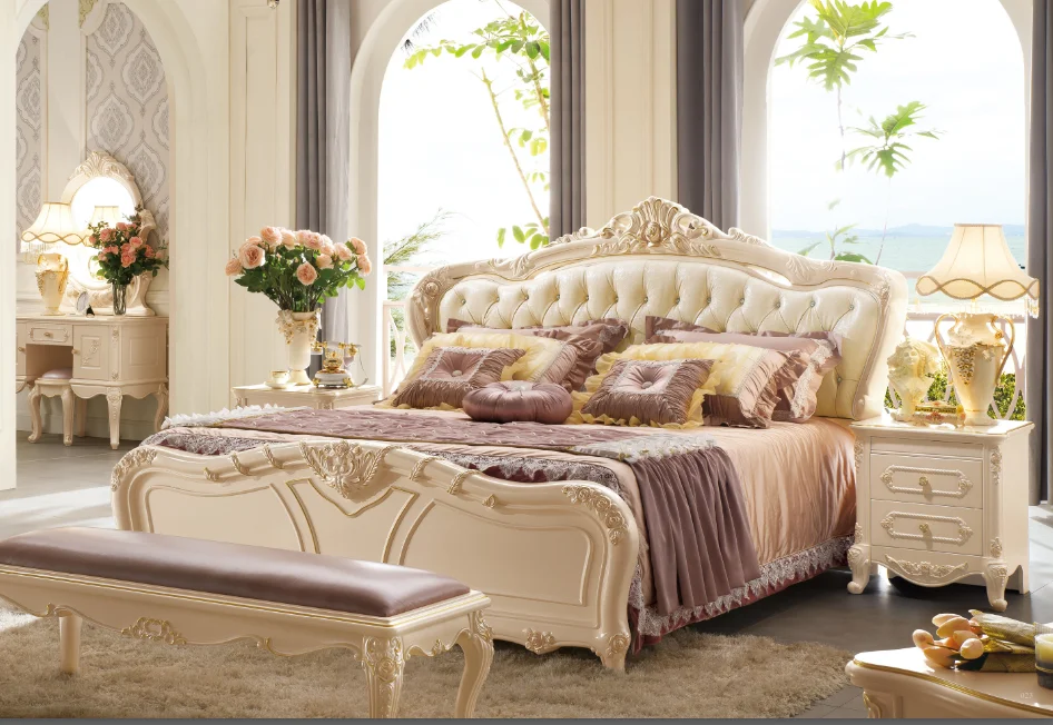 New French Rococo Style White Bedroom Furniture Set Wood High Back Full Leather Bed