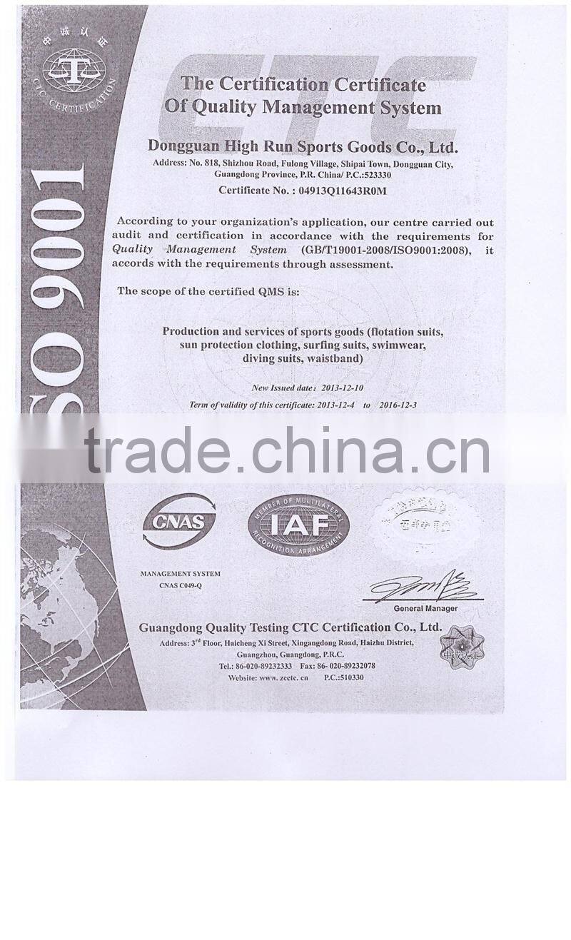 As a professional and reliable water sports manufacturer.We specialize in producing water sports products.including rash guard,children floatation suit,life jacket,swimwear,beach shorts and socks.Neoprene wetsuit,surfing suit,neoprene bag and all kinds of neoprene products,sports clothes and dog apparel.