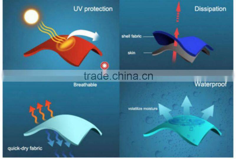 2. UPF 50+ UV protection rating of UPF50+.Our UV protection products are unique in the industry.Our sun protection products block 98% of the harmful UV rays.Sun Protection is mainted in wet and dry condition.This material offer comfortable and perfect for all aquatic relative outdoor activities.