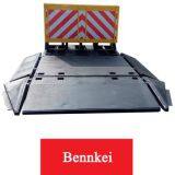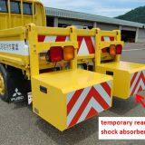 TOMARUKUN operates on the principle of leverage in using the forward moving force of the vehicle to lift its front wheels off the ground.Simultaneously,the weight of the vehicle itself generates friction between the road surface and the specially designed rubber on the bottom of the device which forces the vehicle to come to a stop.This mechanism is also effective with the impact of a vehicle coming in at an angle.