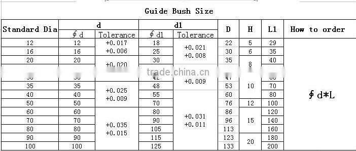 Guide bush is made of the finest quality alloy steel. They are hardened and precision ground to reduce wear and give longer life under severe molding on die casting conditions. The ID is ground to close tolerances in order to maintain a smooth, but firm , running fit with standard guide pins.