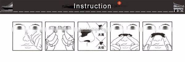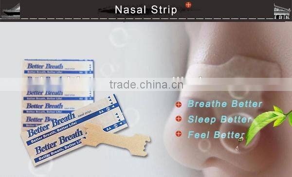 Nasal strips are used to prevent the nasal soft tissues from shrinking to the nasal cavity when breathing, which can effectively expand the nasal ala and the nasal cavity, increase the ventilation quantity for the nose, cure rhinostegnosis, and relieve snoring and suffocation, and which have distinct effects on rhinobyon, headache andsleeping with an open mouth caused by rhinitis, chronic rhinitis and rhinostegnosis.