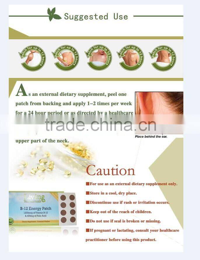 Each patch contains 1200 mcg of the expensive, highly absorbed active form of Vitamin B12 (methylcobalamin) and 400 mcg of Folic acid. This is important, because most B12 supplements are of the cheaper, less absorbed, less active form, cyanocobalamin. Best of all, the nutrients can be quickly absorbed simply by applying the patch behind the ear.