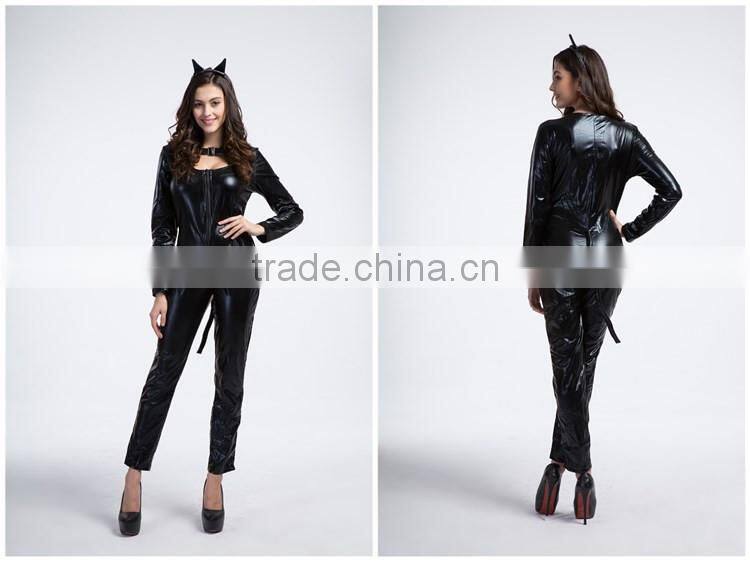 High quality black latex zipper front long romper sex sexy catwoman costume lingerie with tail |