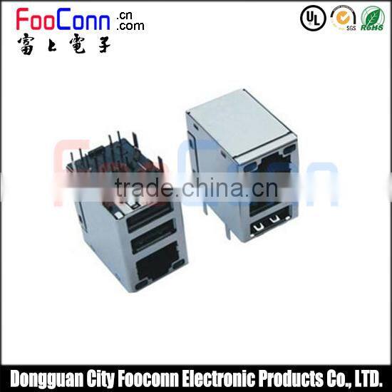 Dual USB to RJ45 connector parts 6P Shield Jacks with LED and EMI side entry