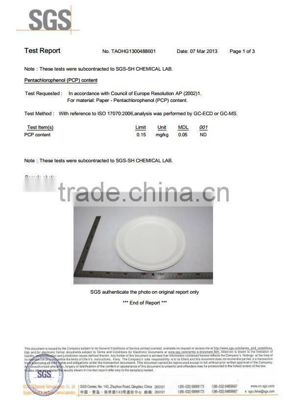 All physical properties and sanitation indexes of the paper pulp molding eco-friendly catering tools pass national GB18006 and 1-1999 standards and accord with detection standards of international hygiene organizations such as FDA, SGS and Health and Welfare Ministry of Japan.