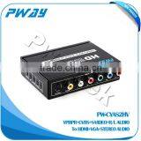 The YPbPr+CVBS+S-video to HDMI signal converter which will convert YPbPr/S-video/CVBS video signal and R/L audio signal to HDMI / VGA signal and stereo. It offers solutions for digital entertainment center, HDTV retail and show site, HDTV, STB, DVD and Projector factory, noise space and security concerns, data center control, information distribution, conference room presentation, school and corporate training environments.