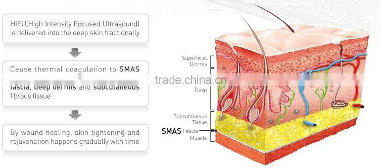 3.It will produce thermal effect to the dermal collagen fibers and stimulate the fat layer and SMAS. The result is far better than any other machine.