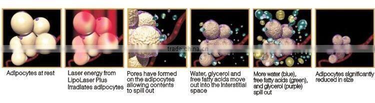 LipoLaser pads containing laser diodes that eimit specific wavelengths of light designed to target fat cells reduction (620- 680nm) are placed on the patient's skin for 30 minutes per treatment on targeted areas. Laser energy safely and painlessly penetrates several millimeter into the subcutaneous adipose or fat tissue layer. The adipose cell walls are made permeable for a temporary period allowing cell contents to spill out into the inter space. The fat (in the triglycerides) is converted to free fatty acids, water and glycerol.