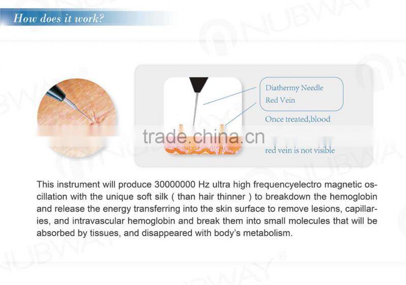 High frequency treatment instrument releases the high frequency energy instantly. The energy is transferred to the subcutaneous tissue through the soft silks (thinner than hair) to remove the diseased capillaries, and break the intravascular hemoglobin into small molecules. The broken molecules absorbed by tissues, and their previously occupied space covered by new skin tissue. By this way, spider veins will never rebound.