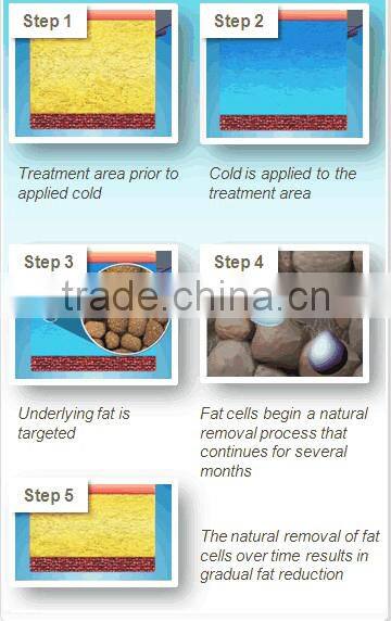 Cryolipolysis machine using a special cool handle applied to treatment area to extract energy from the underlying fat tissue without damage to other tissues. During Treatment period, the cool handle uses vacuum pressure to draw the tissue between the 2 cooling panels and delivers precisely controlled cooling conditions, -15°C~5°C, to treatment area. Low temperature make triglyceride of body fat converted into solids, crystallization and death continuously, at last out of body along with metabolism. Because of body fat reducing gradually, so it can achieve desirable effects for body slimming, cellulite removal and body shaping.