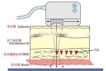 higher region -- the focal region within SMAS, but thorough subcutaneous 3.0mm-4.5mm make the SMAS organization in the 0.5second temperature up to 65 ℃(all non intrusive firming the strongest temperature instrument) resulting in the SMAS organization of collagen recombination without damage to normal tissue outside the focal region, so as to enhance the effect of fascia.Ultrasonic technology refers to a radio frequency is higher than 20000HZ sound people cannot hear. 20000 -10 billion times per second vibration, is generally produced by mechanical vibration.