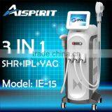 The 3 in 1 intelligent beauty machine is multi-function which integrates with SHR+IPL+ND YAG Laser systems, plug 3 handpieces meanwhile.