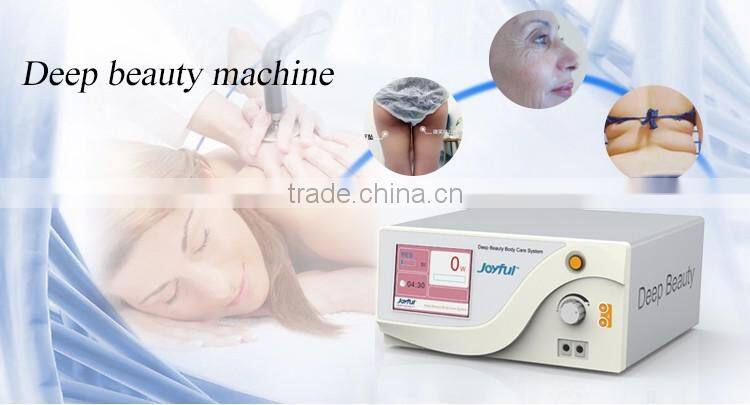 The JOYFUL® deep beauty system uses high-frequency currents emitted through a metal massage head to firm skin and lift contours. It can break up fat cells, speed up metabolism and drain out toxins.