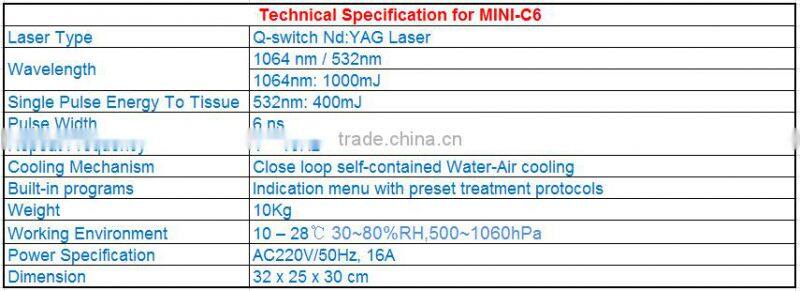Mini C6 is an innovated, reliable and versatile Q-switch Nd:Yag laser for dermatological and aesthetic indications, including tattoo removal, pigmented and dermal lesions, including melasma, tattoo, epiderma nevi, ota, etc. Mini C6 is NOT a passive-Q switch laser. It is a totally new design against traditional laser concept, to provide high performance laser functionalities in a very compact design.