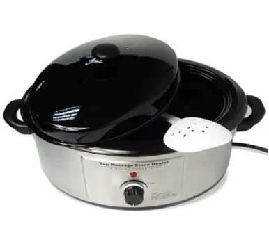 *Remove the stones carefully using the slotted spoon and place them on a towel to begin cooling. You may need to line your stone carrier with a towel and place them inside to transfer them to where you need them for the massage. They will be too hot to place directly on the skin from the warmer, but you can place them in the cold water a few seconds if necessary.