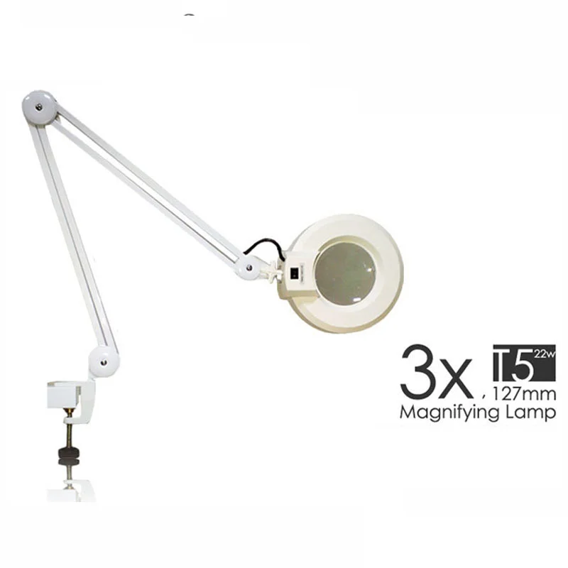 Magnification: 3X. 22-watt fluorescent bulbs, daylight spectrum; eye-pleasing, efficient & cool-burning.
