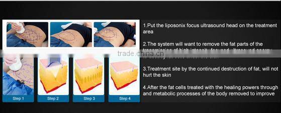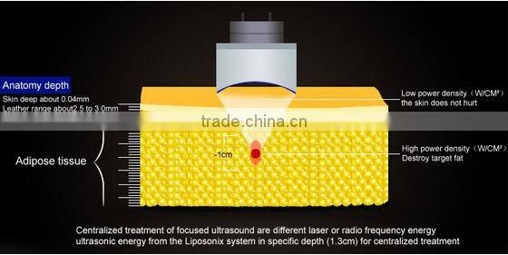 High Intensity Focused Ultrasound penetrates focused and volumetric ultrasonic energy at precise depth (13mm) in subcutaneous fat layers targeting fat tissue causing a non-thermal effect. The surrounding structures such as the epidermis, blood vessels and nerves will not be damaged. Meanwhile the metabolized contents (triglyceride, fatty acid) of cells will excrete outside body automatically through blood circulation and lymphatic drainage without harm to the human body.