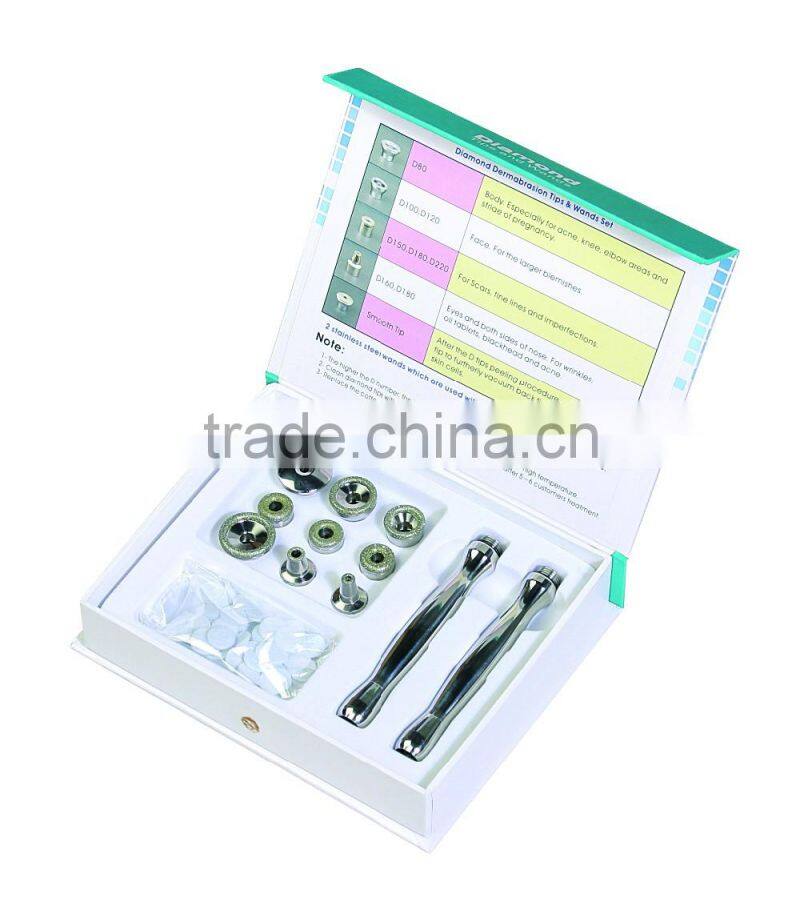 This beauty equipment provided a non-surgical skin refinish procedure, by using sterile diamond heads to abrade or rub off the top skin layer, then vacuuming out the particles along with any dirt and dead skin backup.