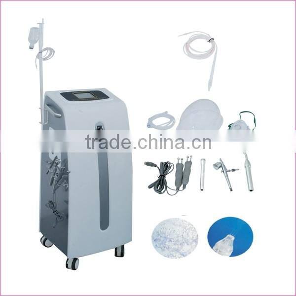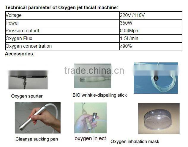 The omnipotence oxygen jet ionizes the gas of the air and creats the oxygen of 98% purity under the high pressure separation method. Together with the special design nozzle, lance boom and facial mask, the jet injects, spays and inhales the oxygen directly to the wrinkle and dry skin, which makes the skin adsorbs the oxygen quickly, adds the activity of the human cells and accelerates its metabolism so that it can reach an unbelievable treatment effect. Meanwhile, it also can use the suction of the sucking pen to cleanse the lymph, use the soft-photon to nurse skin, use the BIO biology current to pull skin