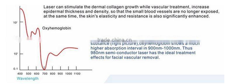 980nm laser penetrates into skin through fiber output it is absorbed by the target tissue hemoglobin and produce thermal coagulation the coagulation hemoglobin will block the unusual vessel the unusual vessel will disappear .980nm wavelength laser will be highly and selectively absorbed by hemoglobin our 980 laser machine adopt this theory the angiotelectasis will be thermally coagulated and blocked by 980nm laser then scab and fall down the surrounding tissue will not be injured .