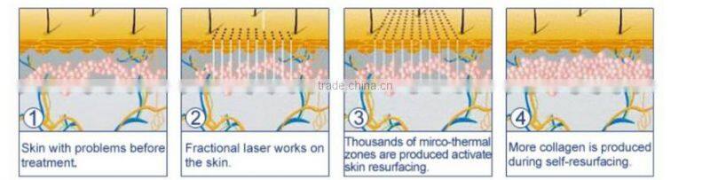 The CO2 laser with a specific wavelength of 10.6 nm can be absorbed by human body tissue (no matter what color the skin is) by nearly 100%. Through laser emitter, the micropulsed laser beam shoots on the target skin in nanometer level to achieve a controllable precise treatment .The dimension of shooting area only can be measured in nanometer, which is precise enough for operators to control and adjust the treated depth andlayer according to the clinical diagnosis.