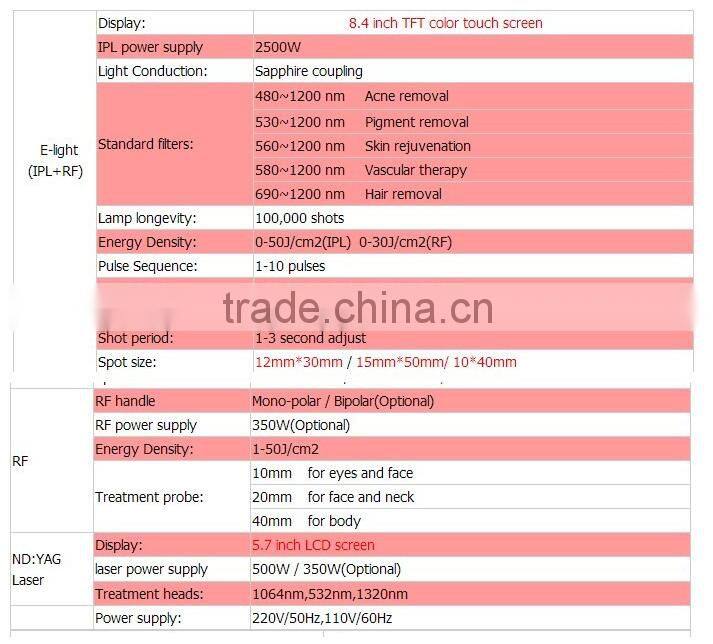 Product specifications of laser + RF+E-light