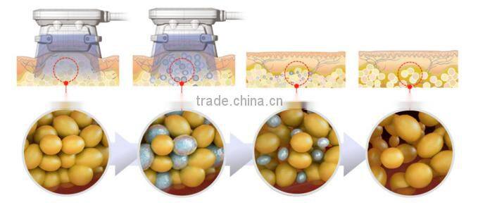 It uses the strong ultrasonic head to shoot 40,000Hz ultrasonic, after entering the body, will make the fatty cells produce mighty cracking effect and fatty cells friction,the broken lipocyte (fat cells) are then moved to the liver and safely metabolized out of the human body, which is assisted by drinking a lot of water. Finally, some content of the adipocytes is metabolized by the liver and eliminated in the urine.