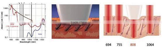 The 808nm near infrared laser of P-808 Hair Removal System is best for absorbing melanin so that can effect in different parts and hair folli- -cle and reach to removing any hair effectively. From the diagram, we can see 808nm is best for absorbing melanin and less absorbing others.
