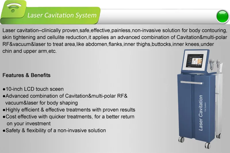 Cavitation is a new technology for breakdown of the fat deposits. This procedure does not involve invasive surgery - there is no need for anesthesia, hospital stay and no down-time. This unique Cavitation technology provides a non-invasive method to breakdown stubborn fat deposits that never seems to disappear no matter what your diet is or how hard you exercise. The most problematic body areas are abdomen, flanks (love handles), inner thighs, buttocks, inner knees, under chin and upper arm. Cavitation slimming machine is the latest development, combining Bipolar RF,Tripolar RF,vacuum technology. It is significantly more effective for fat burning, body shaping, skin tightening and cellulite reduction.