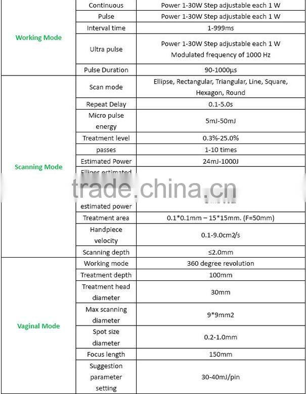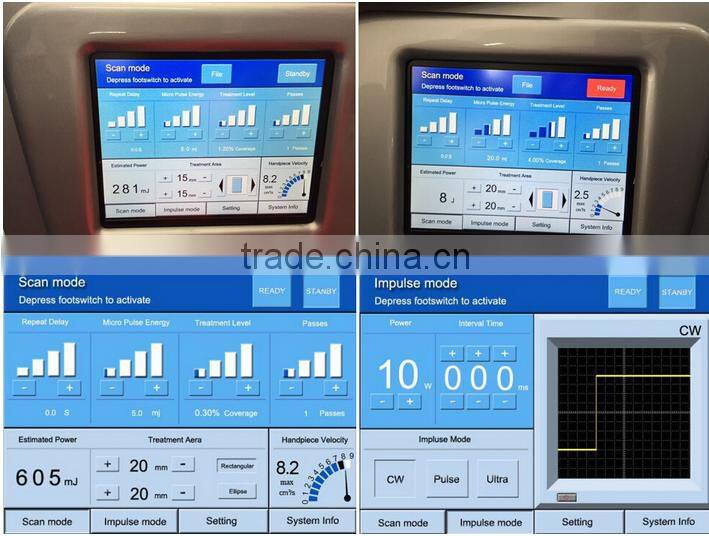 Laser output mode: continuous, single pulse, repeat pulse, super pulse, with the optional pixel laser handpiece for Pixel laser output mode