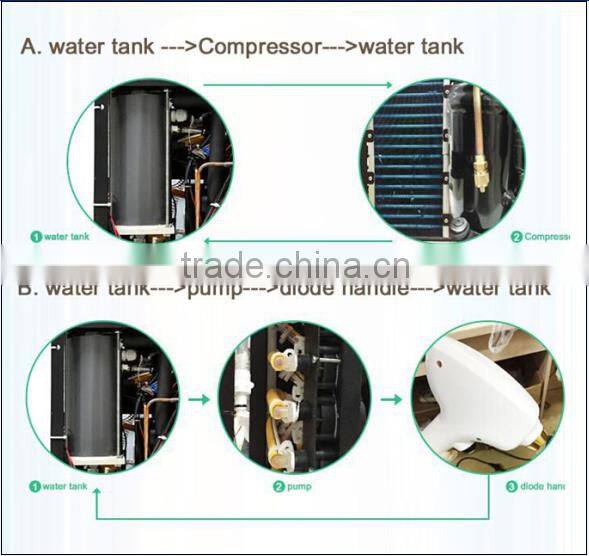 System cooling | refrigerator compressor Treatment principle of 808nm diode laser hair remover: Using thermal damage theory, the abundant melanin absorbs laser energy and the temperature rises rapidly, under this situation the hair follicle and hair shaft are damaged by thermal. At the same time, the oxygen supplying tissue surrounding the hair follicle’s stem cells is destroyed by the spreading heat energy.Thus hair regrowth is stopped permanently. Treatment scope of permanent hair remover: All kinds of hair on body! Such as hair on face, around lip area, beard, underarm, legs,breast, bikini area Etc. |