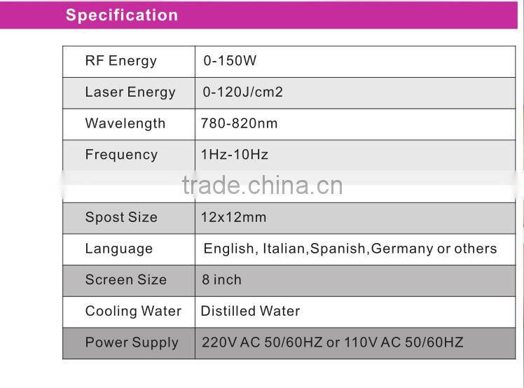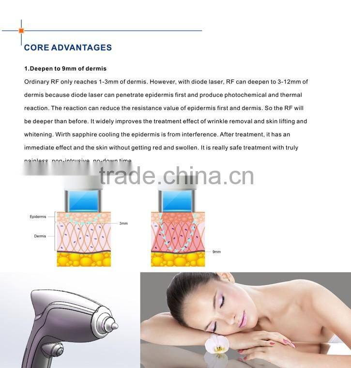 1.Diode laser and RF is complement for each other, So RF deepens 1-9mm of dermis. One treatment can solve such problems: wrinkle removal, reshape the outline and skin whitening and rejuvenation etc at the same. A significant effect is obvious.