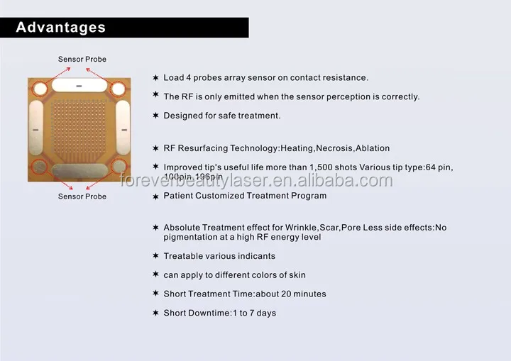 This machine has 3 Lattice treatment tip and 3 fractional rf tip. Both adopted the AMFR technology, Which can be used 2 years at least.