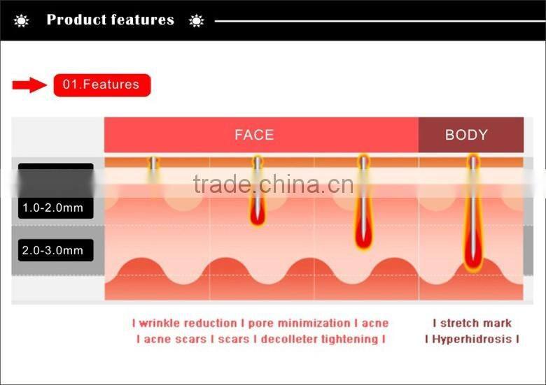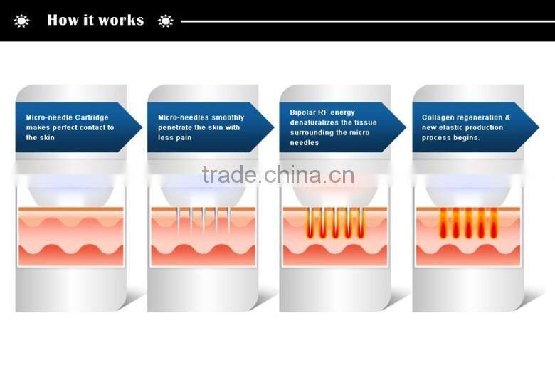 Microneedle fractional rf system is based on synergy effect of a precisely controlled Bi-polar RF plus minimally invasive micro-needles for nonsurgical face lifting.wrinkle reduction.Such an ideal combination reduces treatment time and down time significantly comparing with fractional laser besed treatment.