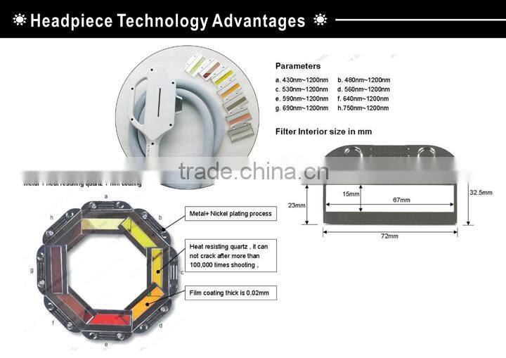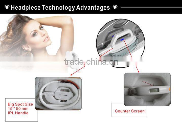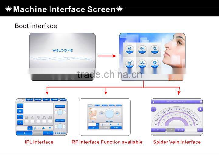 IPL(Intense Pulsed Light) adopts the principle that substance absorbs light selectively.As different target tissues absorbs Pulse Light with different spectrum and the light acts on pigment.Through photo thermal and actinism, the machine could dispel pigment ,concrete blood vessel, burn the hair follicle and stimulate the collagen to regeneration, then it will achieve the aim to dispelling speckles, treating telangiectasis,removing hair and rejuvenation skin.Because the normal skin absorbs little engery , so the treatment is safe!