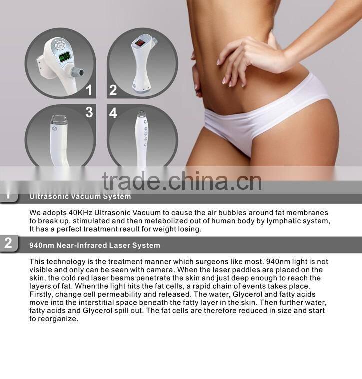 This technology is the treatment manner which surgeons like most. 940nm light is not visible and only can be seen with camera. When the laser paddles are placed on the skin, the cold red laser beams penetrate the skin and just deep enough to reach the layers of fat. When the light hits the fat cells, a rapid chain of events takes place. Firstly, change cell permeability and released. The water, Glycerol and fatty acids move into the interstitial space beneath the fatty layer in the skin. Then further water,fatty acids and Glycerol spill out. The fat cells are therefore reduced in size and start to reorganize.