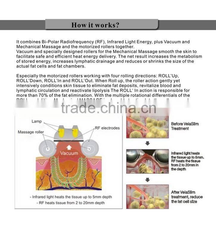 It combines Bi-Polar Radiofrequency (RF), Infrared Light Energy, plus Vacuum and Mechanical Massage and the motorized rollers together.Vacuum and specially designed rollers for the Mechanical Massage smooth the skin to facilitate safe and efficient heat energy delivery. The net result increases the metabolism of stored energy, increases lymphatic drainage and reduces or shrinks the size of the actual fat cells and fat chambers.