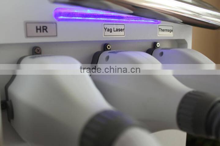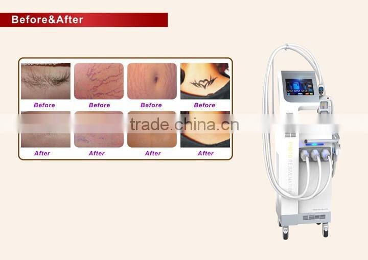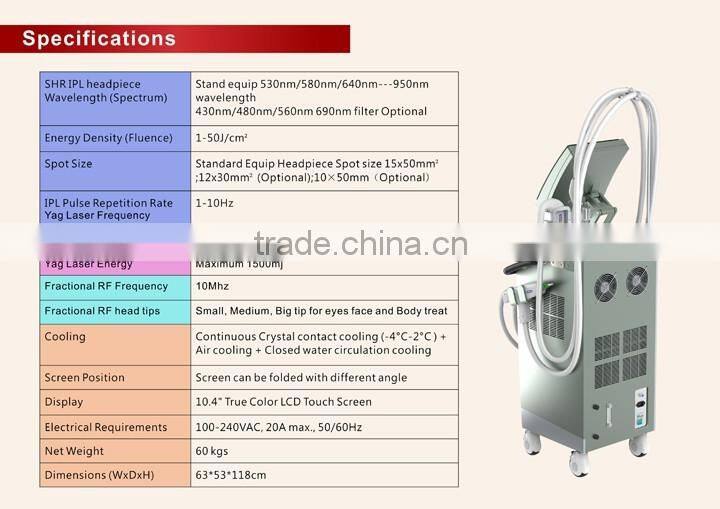 SHR IPL For Fast hair removal, Skin Rejuvenation and Vascular Removal.ND YAG Q_Switch Laser for tattoo removal, pigmentation removal; Fractional RF for Stretch marks removal, wrinkle removal and skin tighten.