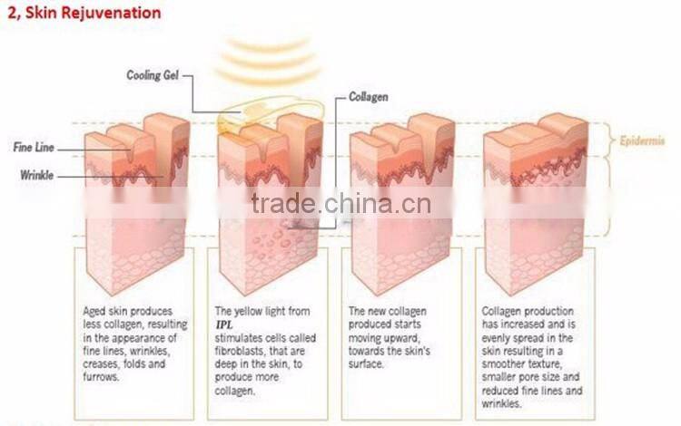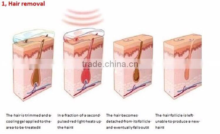 The Mini IPL Hair-removal system emits varied wavelength, broad spectrum and intense pulse light, which permeate epidermis to the dermis of the skin. with the principle of selective absorption,the light is absorbed by the melanin in the hair follicles.Through the optical & thermal effect generated and sourced from the light, it achieves the purpose of removing unexpected hair by rapid destroying of hair follicle tissues permanently.