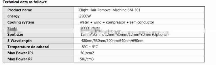 | Model Number | BM-301 | Feature | Acne Treatment, Blood Vessels Removal, Hair Removal, Pigment Removal, Skin Rejuvenation, Wrinkle Remover, Other, Acne Treatment, Blood Vessels Removal, Hair Removal, Pigment Removal, Skin Rejuvenation, Wrinkle Remover, Professional ipl rf opt e light hair removal |