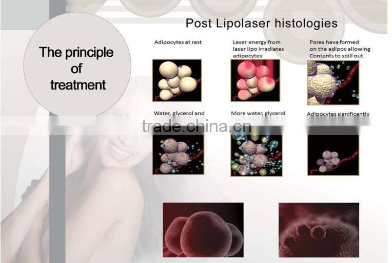 Lipo laser for fat reduction,use the 650nm soft laser to destroy the deep fat cells,broke the cell membrane,change the fat to triglyceride,then leave out the body,thanks to metabolism.The laser heat can Stimulate the subcutaneous dermal tissue collagen and elastic fibers hyperplasia,make the treated area skin tighten and elasticity.